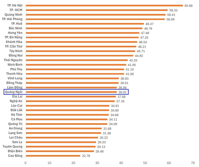 Năm nay, Quảng Ngãi xếp hạng thứ 20/34 tỉnh, thành phố, với 38,02 điểm. Hà Nội tiếp tục dẫn đầu với điểm số cao nhất 65,68 điểm. Tiếp theo là TP. Hồ Chí Minh, Quảng Ninh, TP. Hải Phòng và TP. Huế.
