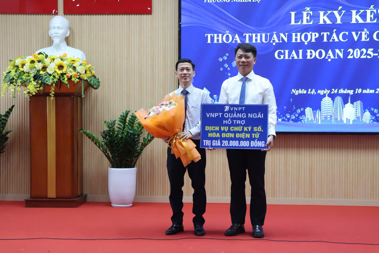Dịp này, VNPT Quảng Ngãi tặng phường Nghĩa Lộ gói dịch vụ chữ ký số, hóa đơn tiền điện trị giá 20 triệu đồng.